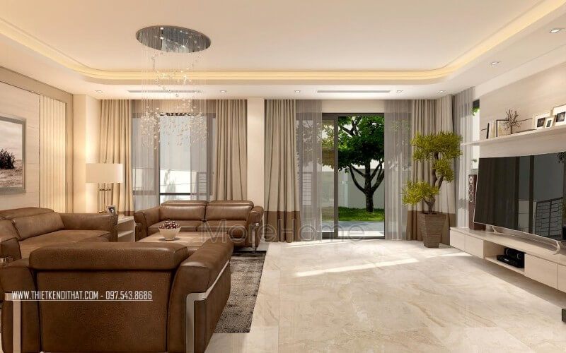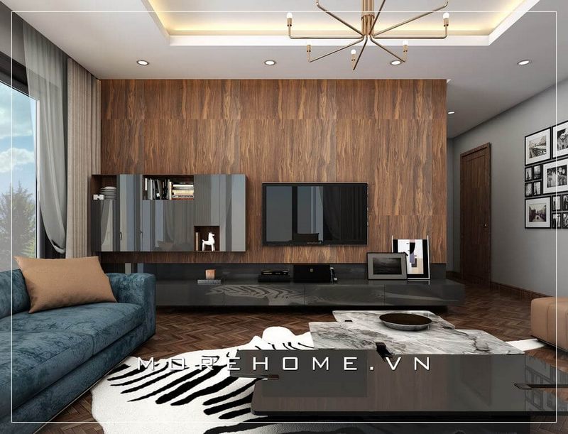 Thiết kế nội thất phòng khách biệt thự đẹp sử dụng ốp gỗ tường sau ti vi tạo điểm nhấn nổi bật cho căn phòng